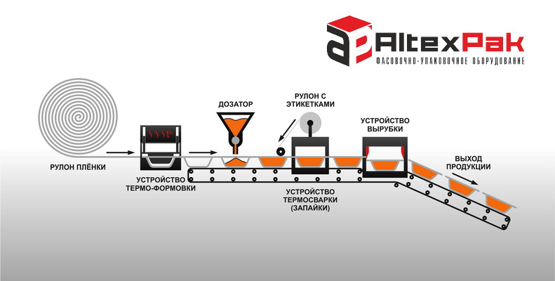 Автоматическая термоформовочная фасовочно-упаковочная линия AltexPakБЛИСТЕР - это оборудование полного цикла фасовки и упаковки любых товаров, начиная с выдува пластикового контейнера или стаканчика из полимерной пленки, заполнения их продуктом (товаром) с помощью дозатора, запайки покровным материалом с напечатанной этикеткой и вырубка герметичных стаканчиков или контейнеров, заполненными продуктом (товаром), на отдельные контейнеры.